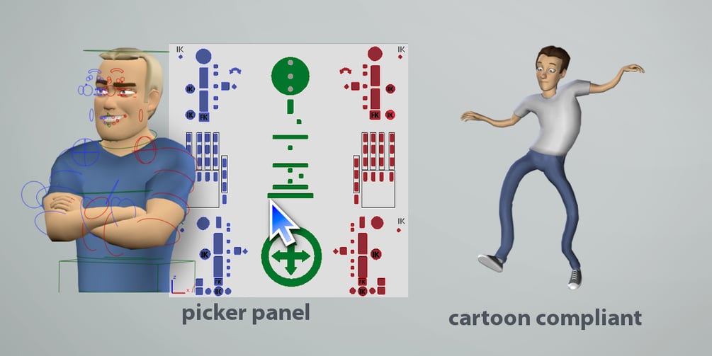 The Secondary Controllers offer a unique control over the pose. Located all along the limbs, they're dedicated to fine pose sculpting, cartoon effects, bending, stretching, etc. Three deformations mode in option: Twist (exportable to Fbx and bendy-bones based for best compatibility), Additive (exportable to FBX), Bendy-Bones (Blender only).